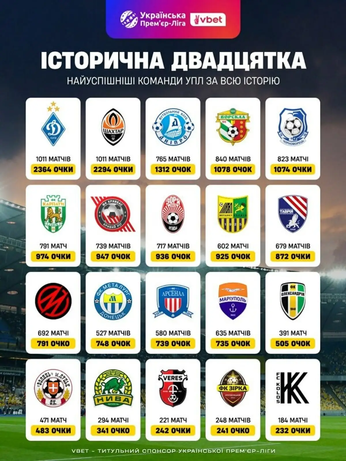Прем'єр-ліга представила рейтинг найуспішніших клубів в історії чемпіонатів України, враховуючи сумарну кількість очок у елітному дивізіоні.