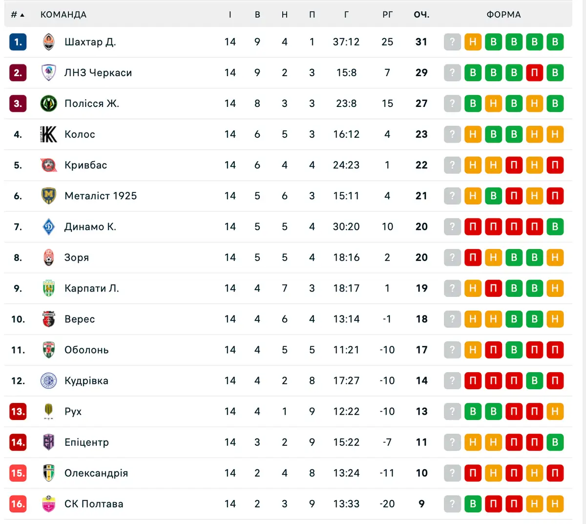 Шахтар продовжує лідирувати в турнірній таблиці з 31 балом, за ним іде ЛНЗ (29 балів), який здолав Кудрівку (14), Полісся (27) обіграло Зорю (2:0), але все одно від відстає від черкасців на 2 бали. На четвертій позиції розмістився Колос (23), чинний чемпіон – Динамо (20) перебуває лише на сьомій позиції. Наразі киян випереджають Кривбас (22) і Металіст 1925 (21). В середині турнірної таблиці розмістились Верес та Карпати, які розділили очки в очній зустрічі (0:0).