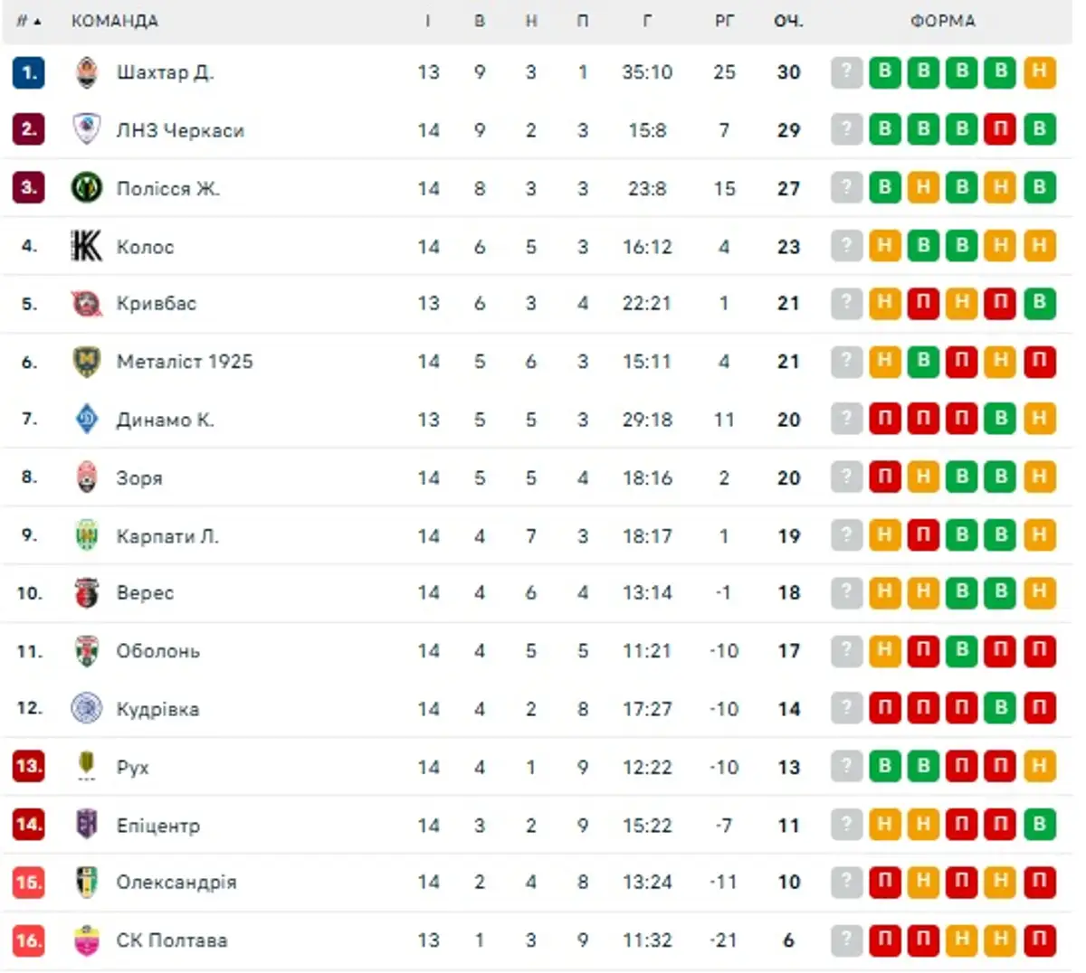 УПЛ, турнірна таблиця: Шахтар лідирує, впевнена хода ЛНЗ, Олександрія в зоні вильоту