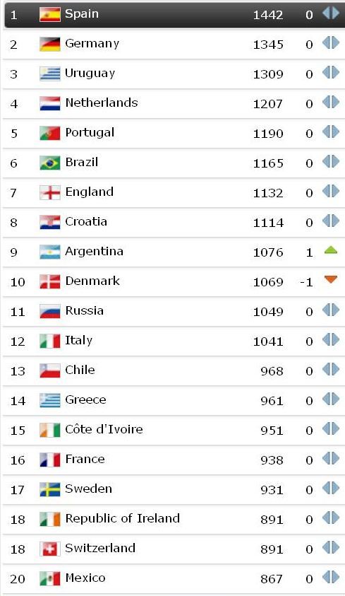 Тріо лідерів рейтингу не змінилося. На вершині - чинні чемпіони світу та Європи іспанці. Друге місце за збірною Німеччини. Третє - володарі Копа Америка уругвайці. Єдина зміна в десятці найсильніших - Аргентина витіснила з дев'ятого місця Данію.
