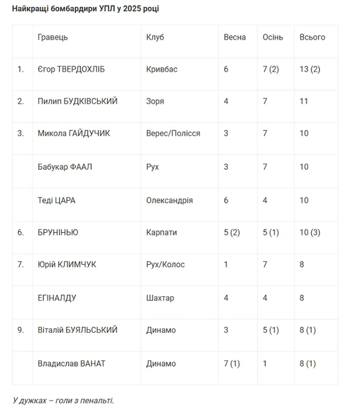 На другому місці розташувався нападник Зорі Пилип Будківський з 11 точними ударами (4 весняних + 7 осінніх). Третю сходинку ділять відразу троє гравців з 10 голами – Микола Гайдучик (Верес/Полісся), Бабукарр Фаал (Рух) та Теді Цара (Олександрія). Цікаво, що представників Динамо і Шахтаря немає навіть у топ-6. Егіналдо, Буяльський і Ванат розташувалися лише на сьомій сходинці, забивши по 8 голів.
